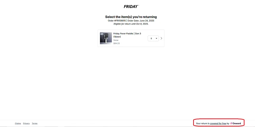 When Onward is covering your return, you’ll see “Onward Sponsored” in the bottom-right corner of the portal page (as shown below). In this case, return shipping is fully covered by Onward, and you pay nothing to send your item back.